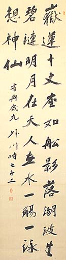 絹本肉筆・・縦137.3cm、横36cm 「外川時七十二」の下に、陰刻「松世印」と陽刻「 雙官盧館」の落款が押されている。内山外川は越 中の人で、名は松世、号を外川と称し、富山藩士 小池春香の長男でるが、村役内山家の養子とな り、京に出て漢学を草場船山に学び、次いで上京 して慶應義塾に学び、衆議院議員となって犬養毅 や若槻礼次郎らと親交を結び、富山農工銀行や 富山信託銀行を創立し、頭取を務めた政治家の 実業家であるが、同時に富山に在って漢詩会を 開き、富山漢詩壇の指導的な立場にも立ち、多数 の漢詩を残した漢詩人としても、知られている。 |