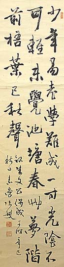 紙本肉筆・・縦137.5cm、横32.5cm 「素堂迂史」の下に、陰刻「中邨儀印」と陽刻「字 曰完伯」の落款が押されている。中邨素堂は静岡 の人で、名は儀雄、字は完伯、号を素堂と称し、 書を武田霞洞に学び、貞香会を創立主宰し、大 正大学(名誉教授)や武蔵大学等で20年以上に 亘って書を教授し、西川寧・松井如流らと戦後の 書道界を復興させた先駆的存在で、添書・隷書を 得意とした書家で、歌人としても知られている。本 品は行書で、氏の若書き作品である。 |