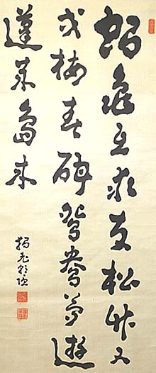 絖本肉筆・・縦112.7cm、横51.5cm 「鶴老釣漁」の下に、陰刻「宇佐宿社」と陽刻「横 田卿族」の落款が押されている。横田鶴老は豊前 の人で、名は國臣、字は卿族、号を鶴老と称し、 初め広瀬淡窓の咸宜園で漢学を学び、上京して 慶應義塾に学び、司法省に出仕して検事となり、 五年間のドイツ留学後、民刑局長・司法次官・検 事総長・大審院院長等を歴任した法律家で、和仏 法律学校(現、法政大学)の校長も務めている。 |