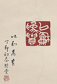 縦29cm、横33cm 「碧堂」の下に、陽刻図象印「碧堂」の落款が 押されている。田邊碧堂は備中の人で、名は 華、通称は為三郎、字は秋穀、号を碧堂と称 し、幼 幼くして塾師に句読を学ぶが、多病にし て学を廃して詩書画に楽しみ、身を実業に起こ し、大東汽船の社長等を務め、亦た衆議院議 員も務めるが、森春濤の茉莉吟社で漢詩を学 び、漢詩人として名を馳せ、『衣雲集』『凌滄集』 等の漢詩集を公刊して、「絶句碧堂」と喧伝され るが、書や篆刻にも堪能で、晩年には大東文 化學院の教授を務めている。 「丁卯初春」と有れば、昭和2年碧堂63歳の 時の品である。 |