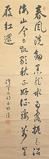 紙本肉筆・・縦130cm、横40cm 「陸軍中将白水淡」の下に、陰刻「白水淡印」と陽 刻「家在于天拜山下住」の落款が押されている。 白水孤峯は筑前の人で、名は淡、号を孤峯と称し 、陸軍教導団生徒から陸軍士官学校へ進み、歩 兵第6旅団長副官・台湾駐剳軍参謀・第9師団参 謀長・第14師団長等を歴任した陸軍中将の軍人 であるが、漢詩人としても知られて『孤峯詩鈔』を 著している。尚、小説『坂の上の雲』の中には、「日 露戦争時に漢詩を作れたのは大将・中将級の年 齢の者で、少将クラスの人間にその素養はなく、 それよりも若い世代には無縁のものだった」との記 述が有る。 |