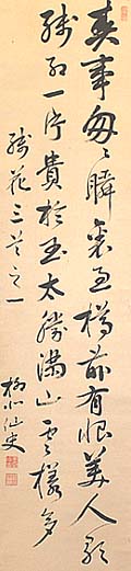 紙本肉筆・・縦136cm、横32.5cm 「柳北仙史」の下に、陰刻「墨上漁史」と陽刻「松菊荘」の 落款が押されている。成島柳北は江戸の人で、名は惟弘 、字は保民、号を柳北・確堂・濹上漁史などと称し、幕府 奥儒者成島筑山の子で、家学を受けて奥儒者となり、将 軍侍講として家定・家茂の二代に渉って経書を講じ、幕末 に当たって外国奉行や会計副総裁等も務めるが、幕府瓦 解に際しては松菊荘と名付けた向島の家に隠棲し、維新 後はジャーナリストとなり朝野新聞社長として健筆を振る った儒者で、柳橋の変貌を記した『柳橋新誌』は有名であ り、また作家の永井荷風は、彼の外孫に当たる。 |