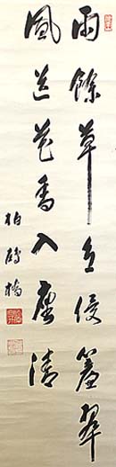 紙本肉筆・・縦130.5cm、横32.5cm 「柏鷗橋」の下に、陰刻「藤原直升」と陽刻「號曰鷗橋」の落款が押 されている。柏木鷗橋は長州の人で、名は直升、通称は勘八郎、 号を鷗橋と称し、叔父に当たる井上馨の仲立ちで小倉の行橋の豪 商柏木家の養子となり、明治3年の豊津藩庁建設に出仕したり、明 治34年の陸軍演習に当たり邸宅を提供(森鴎外が宿泊)したりして いるが、生卒等具体的な事は不明である。 柏木家は代々小笠原家に仕えた武士で、明石から小倉に移り武士 から商人になった家柄で、三代勘八郎直則が家禄を弟の直定に譲 って行橋に移り、商人となっている。正八幡神社に歌碑を残す直純 (山辺秋人、明治19年死去)は、直定の孫で本家柏木家六代目に 当る。本品の直升は行橋に移った直則の後裔で、恐らく三〜四代 後の人物であろう。 |