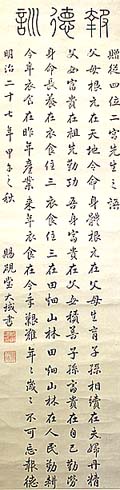 紙本肉筆・・縦122.5m、横30.5cm 「賜硯堂大域書」の下に、陰刻「成瀬温印」と陽刻「 號大域」の落款が押されている。成瀬大域は遠江 の人で、名は温、字は子直、号を大域・桂斎・賜硯 堂などと称し、幼にして母方の祖父に書を習い、東 京に出て安井息軒や河田甕江らに漢学を学び、宮 内省に勤めて奉勅の「王羲之聖教序臨書」を献じて 硯を賜り、日下部鳴鶴らの六朝風書に反対し、長三 洲らと顔法に傾倒した書家で、字学にも通じている。 |