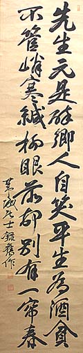 紙本肉筆・・縦136.4cm、横43.4cm 「葦城居士録舊作」の下に、陰刻「熊田重宗」と陽 刻「号葦城」の落款が押されている。熊田葦城は 備後の人で、名は重宗、通称は宗次郎、号を葦 城と称し、報知新聞の編集局長を務めたジャーナ リストにして文筆家で、『赤毛布洋行奇談』『明治 才媛美譚』(明治33)・『日蓮上人』(明治44)・『 幕府瓦解史』(大正4)・『佐倉史談』(大正6)・『江 戸懐古録』(大正7)・『日本史蹟大系』(昭和10) 等の著作を公刊している。 |