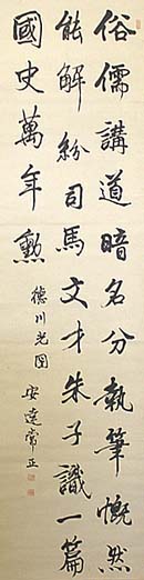 紙本肉筆・・縦146.2cm、横38.3cm 安達常正の下に、陽刻「富山縣士族」と陰刻「安達 常正」の落款が押されている。安達外山人は富山の 人で、名は常正、号を外山人と称し、富山師範学校 の訓導を務めた後、上京して東京高等師範学校理 化学科を卒業(明治22年)後、23年に広島師範学 校教諭となり、31年に広島県師範学校長、32年に 鳥取県師範学校長、35年に北海道師範学校長、4 0年に栃木県師範学校長に、その後奈良師範学校 長に赴任している。島崎藤村の小説『破戒』のモデ ルだと言われている、飯田市出身の教育者大江磯 吉に休職命令を下したのが、鳥取県師範学校長時 代の彼である。また『南海の尚友』(明治23年)『漢 字の研究』(明治42年)等の著作も公刊し、漢学者 としても知られており、同時に大日本教育会・帝国 教育会の会員で、可成り熱烈な国家主義的教育者 でもあるが、生卒等詳細は不明である。 |