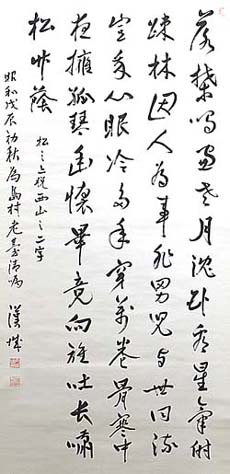 紙本肉筆・・縦129cm、横63cm 「漢城」の下に、陰刻の「安達謙印」と陽刻の「漢 城」の落款が押されている。安達漢城は熊本の人 で、名は謙蔵、字は原泉、号を漢城と称し、初め 郷里の友枝私塾等で漢学を六年間修め、次いで 済済黌で学び、後に東京に出て政界に入り、逓 ・信内務等の各大臣を歴任した政治家であるが、 漢詩人としても有名で、、「太平洋」や「追悼詞」な どの作品は、吟詠の教本にも良く採取されている 。亦彼は、漢学振興の為の「大東文化協会」設立 の第3回協議会参加者である。 |