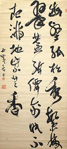 紙本肉筆・・縦133cm、横59.5cm 「西疇居士」の下に、陰刻「古安南?子印」と「 西疇居士」の落款が押されている。原田西疇 は安芸の人で、名は隆、字は子隆、号を西疇 と称し、品川砲台長や松本裁判所上席検事等 を務めた後、京都に住して衛鋳生に学び、篆刻 家・漢詩人として活躍した人で、隷書と篆刻に 長じた清人陳鴻誥の詩集『味梅花館詩鈔』(明 治13年)を編集し、また『文字縁談』(大正12 年)なる本も公刊している。 |
