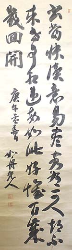 絖本肉筆・・縦133cm、横41cm 「如舟老人」の下に、陽陰刻「小川琢印」と陽刻「 如舟書屋主人」の落款が押されている。小川如舟 は和歌山の人で、名は琢治、号を如舟と称し、田 辺藩儒者淺井南溟の次男で、幼にして父親から 四書五経を受け、元紀州藩士小川家の養子とな って東京帝大地質学科を卒業し、農商務省地質 調査所に勤め、日露戦争勃発に伴い大本営付き となって中国大陸の地質調査を行い、その後京 都帝大の教授となって『支那歴史地理研究』『支 那古代地理学史』等を公刊した、地質地理学者で あるが、同時に冶金学者小川芳樹・東洋史学者 貝塚茂樹・物理学者湯川秀樹・中国文学者小川 環樹らの父親である。 |