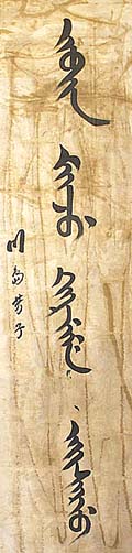 絹本肉筆・・縦132cm、横32cm 「川島芳子」の署名が有る。川島芳子は、清朝の皇族 粛親王の第14王女で、本名は愛新覚羅ケンシ、字は 東珍と言うが、清朝の北京警務学堂の学長を務め、粛 親王の顧問であった川島浪速の養女となり、川島芳子 として日本で教育を受け、日中戦争時代は中国に渡っ て金璧輝と名乗り、日本軍の諜報活動に従事し、戦後 中華民国政府に因り銃殺刑に処せられている。男装 の美人スパイとして活躍した事と、その出自の華麗さ から、「東洋のマタハリ」と称され、彼女の一生は、多く ドラマ化や映画化されている。 |