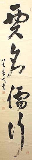 紙本肉筆・・縦135cm、横29.2cm 「八年老人書」の下に、陰刻「塚本源印」と陽刻「八 年」と陰刻「近江商人」の落款が、右下には陽刻「薄 利廣商」の落款が押されている。塚本八年は近江の 人で、名は源三郎(二代目)、号を八年と称し、近江 の豪商で文人墨客と交流を重ね、『柿屋詩存』(昭 和10年)『蟲聲集』(昭和11年)等の詩歌集も公刊 している文化人で、書家(母親が淡海書道学校や淡 海女子学校等を作った塚本さと)として盛名が有る。 |