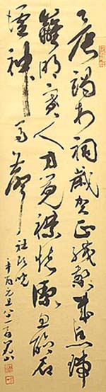 紙本肉筆・・縦121.6cm、横32.3cm 「見山」の下に、陰刻「木邨明印」と陽刻「見山」 の落款が押されている。木村見山は紀州の人 で、名は明、字は士達・子発、号を見山と称し、 本姓は中井氏であるが木村大譲の養嗣子とな り、地方の教育普及に尽力した儒医で、漢詩人 として盛名が有る。尚、彼の子が歌人として知 られた木村成軒である。尚、昭和元年に成軒 の手に因り見山の遺稿集『愛静居詩稿』が刊 行されている。 |
