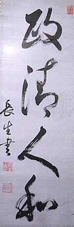 絹本肉筆・・縦114cm、横35cm 「長生書」の下に、陰刻の「長生之印」と陽刻の「鐵 鸚」の落款が押されている。小笠原鐵鸚は江戸の 人で、名は長生、号を鐵鸚と称し、唐津小笠原藩の 最後の藩主長国の継子(本当は、初代藩主長昌の 子で、世子の身分で幕政に参画し、老中格となり第 二次長州征伐の指揮官となった、小笠原長行の実 子である)で、海軍兵学校卒業後、天城・八重山の 乗員を経て巡洋艦分隊長として日清戦争に出征し、 その後、軍令部諜報課員・軍令部参謀・巡洋艦艦 長等を歴任した、海軍中将の軍人で、退役後は宮 中顧問官を務めている。 |