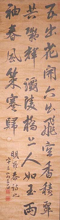 紙本肉筆・・縦104cm、横29.5cm 「三石」の下に、陰刻の「澤喬之印」と「三石老人」 の落款が押されている。澤三石は安芸の人で、名 は喬、字は伯遷、号を三石・梅ウ(阜+烏)などと 称し、芸州広島藩浅野公の年寄職を務め、七代 藩主重晟・八代斉賢・九代斉肅と三代に渉って藩 政に参与し、致仕後は書画を楽しみとした文人武 士で、同時に儒者でもあり特に能書家として有名 である。尚、彼の書は、藩校修道館の流れを汲む 修道学園と、新居浜市立郷土美術館に、各々一 本づつ所蔵されている。 |