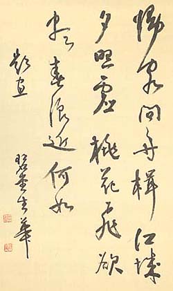 絹本肉筆・・縦43cm、横28cm 「碧堂生華」の横に、陰刻「田華」と陽刻「碧堂」 の落款が押されている。田邊碧堂は備中の人 で、名は華、通称は為三郎、字は秋穀、号を碧 堂と称し、幼くして塾師に句読を学ぶが、多病 にして学を廃して詩書画に楽しみ、身を実業に 起こし、大東汽船の社長等を務め、亦た衆議 院議員も務めるが、森春濤の茉莉吟社で漢詩 を学び、漢詩人として名を馳せ、『衣雲集』『凌 滄集』等の漢詩集を公刊して、「絶句碧堂」と喧 伝されるが、書や篆刻にも堪能で、晩年には大 東文化學院の教授を務めている。 |