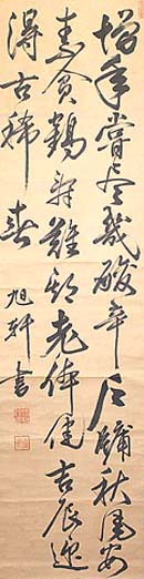 紙本肉筆・・縦134cm、横34.5cm 「旭軒書」の下に、陰刻「増戸鶴印」と陽刻「旭軒」 の落款が押されている。増戸旭軒は、名は鶴吉、 号を旭軒と称し、明治後半から昭和初期にかけて の教育者で漢詩にも長じ、滝川学園歌の作詞者 でもあり、室蘭中学校初代校長や滝川中学校校 長等を歴任し、『小学校に於ける国語科教授法』 (明治34年)・『学校管理法及教育法令』(明治3 5年)・『仮名遣自修便』(明治39年)・『かなづか ひ教科書』(明治43年)等を公刊している。 |