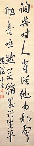 紙本肉筆・・縦131.5cm、横33cm 「馬陵小史」の下に、陽刻「馬陵小史」と、陰刻「齋藤篤 信」の落款が押されている。齋藤馬陵は米沢の人で、 名は篤信、号を馬陵と称し、初め藩校興譲館で学び、 江戸に出て昌平黌の古賀トウ庵に学んだ後、興譲館 の勤学兼助読となった儒者であるが、戊辰戦争の時 は米沢藩の参謀になっている。維新後は、山形県師 範学校初代校長や学習院教授を歴任し、米沢市丸の 内一丁目に有る招魂碑(戊辰・西南両戦争の戦死者 慰霊)の文は、彼の揮毫に係る。 |