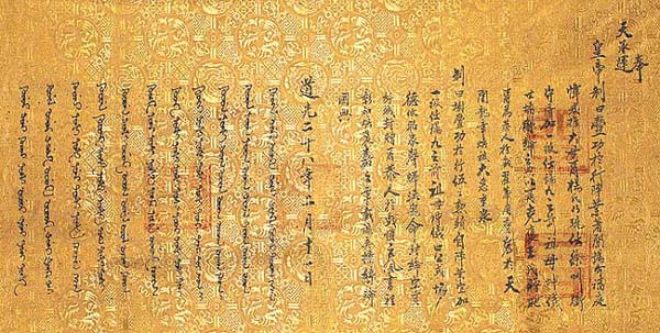 縦44cm、横94cm 堂々たる道光二十八年の奉天聖旨である。鳳凰と龍を織り込んだ金糸の絹布に、漢字と満洲 文字とで書かれている。中央に陽刻の「太上皇帝之寶」、その左側に「??宮寶」、右端に「聖 旨」の印象が押されている。内容は、行陣の功績を称えて一級を加え、祖母の坤儀に綸緞を 賜う、と言うものである。金糸地紋織りの絹布は、確かに清朝時代の布と判断されるが、内容 の文面は果たして当時に書かれたものか否か甚だ疑わしい。因って「伝」の品である。 |