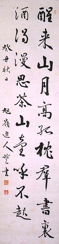 紙本肉筆・・縦136cm、横33cm 「癸丑(大正二年・1913)秋日旭嶺逸人登書」の下に、 陰刻の「藤登之印」と陽刻の「旭嶺樵夫」の落款が押さ れ、関防印は陽刻の「坦齋」である。加藤旭嶺は山形 の人で、名は登太郎、字は升卿、号を旭嶺・坦齋・翠竹 などと称し、近代日本書道の礎を築いた中林梧竹の門 弟で、書を梧竹を初めとして日向竹居や日下部鳴鶴ら に、漢学を後藤種親に、漢詩を柴田節堂に学び、各地 の学校に奉職して書道教育に従事し、昭和三年には朝 鮮総督府より第七回朝鮮美術展審査員を委嘱され、ま た平安書道会の創立に参加して、その幹事や理事を 歴任して活躍した書家である。 |