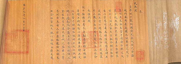 縦36cm、横180cm 左右から満漢両字で書かれ、中央に「勅命之寶」の印(御璽ではない)が押されている。「雙龍紋」及びタイト ルの「奉天誥命」が織紋ではなく、紙に銀墨で書かれており、本文の下地には金彩で鳳龍紋様が描かれてい れば、地位の低い臣下に与えられた奉天誥命であることが分かる。張孫弘猷は直隷の正定協左營千総の地 位に在る人物である。上段が右からの漢字で、下段が左からの満字である。但し、用紙は良いものの、印章 が可成りいかがわしく、且つ「爲」を「為」と識す等、所謂「傳」の品である。 |