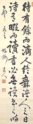 紙本肉筆・・縦120cm、横33cm 「醉梅書人」の下に、陰刻「佐瀬得三印信」と陽 刻「心齋」の落款が押されている。佐瀬醉梅は 会津の人で、名は得三、字は子寧、号を酔梅・ 心斎・儘世などと称し、書家佐瀬得所の三男で 、報知新聞等で記者を務め、『続々当世活人画 』『黄金の世界』等々を公表して文筆活動を行 い、大正4年に両国倶楽部で書画筵を開き、書 家として世に出んとした二年後の大正6年に、 死去したジャーナリストである。 |
