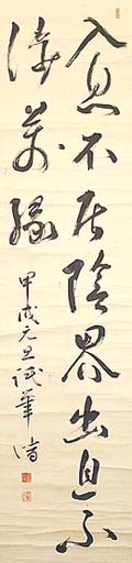 紙本肉筆・・縦129cm、横31.6cm 「潜」の下に、陰刻「永井潜」と陽刻「?象居士」の 落款が押されている。永井靜山は広島の人で、 名は潜、号を静山と称し、幼にして漢学塾浚明館 に学び、東京帝大医学部卒業後、独逸に留学し、 帰国後は母校の教授・医学部部長・台北帝大医 学部部長・京城帝大医学院名誉教授・国立北京 大学名誉教授等を歴任し、日本性学会会長や日 本民族協会会長等も務め、書や詩文・和歌・俳句 等にも長じた、生理学者にして医学者である。 |