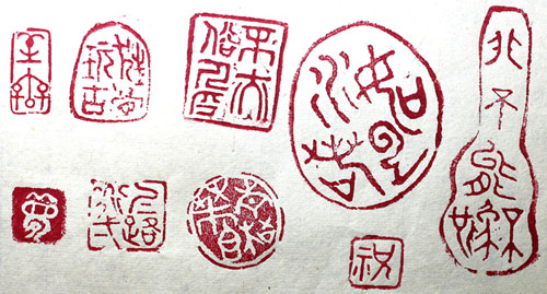 右より・・縦横7.1x2.6cm、5x4cm、1.3cm、2.8x2.3cm、2.5cm、2.6x2cm、1.9cm、 2.2x1cm、0.9cm 11月の閑日に「手慰み」の一斑として磁土を造形し彫った陶印で、右から兔形 陽刻「非不能不爲也(能はざるに非ず爲さざるなり)」、龜形陽刻回印「如水若 雲(水の如く雲の若し)」、方形陽刻「祝」、方形陽刻「不亦俗人乎(亦た俗人な らずや)」、円形陰刻「青梧華香」、方形陽刻「狂骨玩古」、方形陽刻回印「仁道 一路」、長方形陽刻「至無」、方形陰刻「夢」の九顆である。尚、陶印自体は、 |