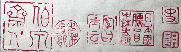 右より縦・横・・1.2cm、2.5cm、2.1cm、1.5cm、3.5cm 全く「篆刻」などと呼べるしろものではない。単に3月の閑日に「手慰み」として彫った文字の「 印」である。右から、陽陰刻下駄印「史朗」・陽刻「日本國臑(儒と臑を音通で兼ねて軟弱な学 者と洒落てみた)員中林史朗」・陽刻「字曰士雲(字を士雲と曰ふ)」・実印風陽刻「中林史朗」・ 陽刻「伯泉齋主人」の五顆である。 |
