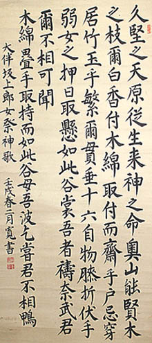 紙本肉筆・・縦133.5cm、横30.5cm 「壬戌(文久2年・1862)春二月寛書」の下に、陽刻「 原田寛」と陰刻「墨園」の落款が押されている。原田墨 園は鳥取の人で、名は永寛、号を墨園・帯霞などと称 し、華岡青洲や箕作阮甫らに漢方や蘭方の医術を学 び、鳥取藩の藩医を務めた医者であるが、同時に藩 の学館尚徳館で儒学と国学を教授した学者でもあり、 神官にして且つ歌人・国学者・儒者・医者でもある。 |