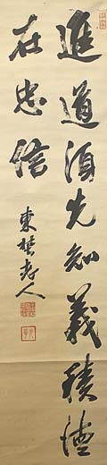 紙本肉筆・・縦150cm、横45cm 「東埜老人」の下に、陽刻「元孚」の落款が押されてい る。元田東野は肥後の人で、名は永孚、字子中、号を 東野・東皐・茶陽・猿岳などと称し、藩校時習館に学ん で熊本藩の京都留守居・高瀬町奉行などを務めた後、 隠退して私塾を開き講説に従事しているが、維新後は 明治天皇の傅となって侍講を兼ね、宮中顧問官や枢 密顧問官を歴任し、教育勅語の草案に与など、明治 天皇の絶大な信任を得た儒者である。 |