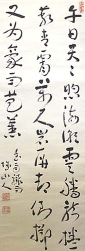 紙本肉筆・・縦139cm、横49cm 「城山人」の下に、陰刻「古城雅正」と陽刻「韓册 博士」の落款が押されている。吉原古城は筑前の 人で、名は雅正、号を古城と称し、初め漢学を日 田の咸宜園に学び、次いで上京して慶應義塾に 学び、高等師範学校教諭等を務めた後、神官とし て権大教正の地位を受け、郷里の木井神社の神 主を務めながら、三島中洲らとも交流した漢学者 にして書家で、『和魂漢才』なる漢詩文集を公刊し ている。 |