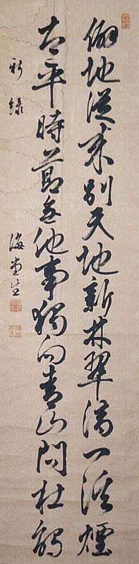 紙本肉筆・・縦135cm、横33cm 「海堂生」の下に、陰刻「貫名肅印」と陽刻「海 堂居士」の落款が押されている。貫名海堂は 兵庫の人で、名は肅、字は子儀、号を海堂・海 叟などと称した書家である。江戸の書家貫名海 屋の後裔乃至は一族ではないのか、と思われ 程に、筆勢は海屋に極めて類似している。尚、 渋沢栄一伝記資料第49卷」には、「貫名海堂 東都後援会」なる記載(昭和3年・1928)が見 られる。 |