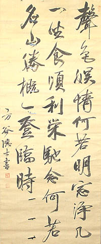紙本肉筆・・縦121cm、横49cm 「方谷隱士書」の下に、陰刻「山田球印」と陽刻「方 谷」の落款が押されている。山田方谷は備中の人で 、名は球、字は琳卿、号を方谷と称し、初め新見藩 儒丸川松隠に就いて宋学を学び、二十三歳で京に 出て寺島白鹿の教えを受け、備中松山藩藩校有終 館の会頭となるが、三十歳で江戸に出て佐藤一斎 に師事し、佐久間象山らと交わり、藩校の学頭とな り更に藩主の侍講となって、藩内の教学の振興に 尽力した儒者で、岡山の閑谷学校の再興にも尽力 している。本品は、惜しいことに三行目に大きな虫 食いが有る。 |