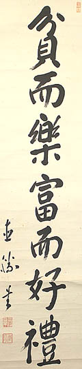 紙本肉筆・・縦131cm、横32cm 「重陽書」の下に、陰刻「雄直勝章」と陽刻「重陽」 の落款が押されている。中尾重陽は豊後の人で、 名は直勝、号を重陽と称し、府内藩士中尾直政 の長男で、学は藩校に学び、武術(剣術・弓道・槍 術・馬術等)も優れ、特に直指流と神道無念流の 剣術に通じ、維新後は官吏となるが大分の警察 等で剣道を教授し、大日本武徳会大分支部の創 立に尽力し、武道の振興と教育に従事した剣術家 である。 |