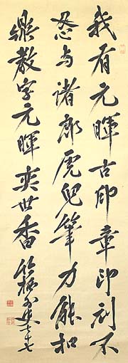 紙本肉筆・・縦135cm、横53cm 「竹栖外史七十七」の横に、陰刻「渋谷碧印」と陽刻 「惟有蘇斎」の落款が押されている。渋谷竹栖は常 陸の人で、名は碧、字は洒候、号を修軒・竹栖など と称し、水戸藩士の家に生まれるが、松代藩士渋谷 家に入って医を業とするが、蘇東坡に私淑してその 書風を習い、江戸に出て藤田東湖・林鶴梁・佐久間 象山らと交流し、書室を惟有蘇斎と名付け、医業の 傍らに子弟に書法を教授した儒医である。 |