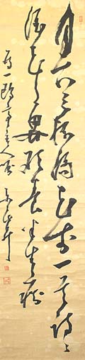 絖本肉筆・・縦129cm、横32cm 「東民昇」の下に、陰刻「何?非娯」と陽刻「幽泉洞主 人」の落款が押されている。渡邊東民は肥前の人で、 名は武常、通称は昇、号を東民・其鳳などと称し、大 村藩士で一刀流を学び、江戸に出て漢学を安井息軒 に、神道無念流を斎藤弥九郎に学び、尊皇活動に奔 走した勤王の志士で、維新後は大阪府知事・元老院 議官・会計検査院長等を歴任した、剣術家にして政治 家で、正三位勳一等の子爵である。 |