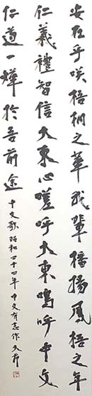 紙本肉筆・・縦161.5cm、横38.2cm 現在、大東文化大学書道研究所研究員である書家 藤森大節氏に揮毫頂いた中文歌である。この中文 歌は、昭和四十四年に当時中文一年生であった学 生有志が、遊び心の洒落で、漢字を並べてそれらし く作ったものである。 安在乎咲梧桐之華(安に在ってか咲かん梧桐の華) 我輩播揚鳳梧之年(我輩は播揚せん鳳梧の年) 仁義禮智信大東心(仁義禮智信は大東の心) 嗟呼大東鳴呼中文(ああ大東ああ中文) 仁道一Y於吾前途(仁道一ら吾前途にYかん) |