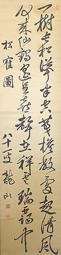 紙本肉筆・・縦132cm、横32.8cm 「八十一叟龍山」の下に、陽刻「龍山」と「好直」の落款 が押されている。宇都宮龍山は伊予の人で、本姓は 原田氏、名は靖、字は好直、号を龍山・竹雪山房など と称し、12歳から伊予藩儒山田東海に朱子学を学び 、16歳で江戸に赴き古賀トウ庵の門に入って修学し、 帰郷して新谷藩藩校教授となった後も、近藤篤山や帆 足万里に教えを受けているが、脱藩して宇都宮龍山と 改名して尾道に住み、三原城代浅野氏の賓師となり、 郷校明善堂の学頭となった儒者で、維新後は尾道に 私塾朝陽館を開いている。 |