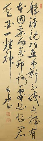 絹本肉筆・・縦108cm、横38cm 「台水書」の下に、陰刻「井出治印」と陽刻「台水 」の落款が押されている。井出台水は吉備の人 で、名は治、号を台水と称し、少年期より俳句を 学び、陸軍軍人として日露戦争に従軍中に、軍 人仲間と句会拍車会を作って荻原泉水・河東碧 梧桐らの指導を受け、大正十年には満洲に渡 り、アカシア会を興して自由律俳句を広め、昭和 十五年の新日本俳句協会の結成に当たっては 実行委員を務めた俳人で、句集『台水句調』(昭 和11年)を公刊している。 |