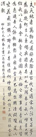 紙本肉筆・・縦152cm、横41cm 「養齋興」の下に、陰刻「殿井隆興」と陽刻「大外」の 落款が押されている。殿井養齋は十津川の人で、 名は隆興、号を養斎と称し、医師の子で幼にして学 問を好み、維新後は御親兵として伏見練兵所に入り 、戊辰戦争従軍後は陸軍大尉として西南戦争に、 少佐として日清戦争に従軍し、中佐に昇進後に軍 職を退き、以後は東京で詩文に親しみ悠々自適の 生活を送り、江戸末・明治・大正・昭和と激動の時 代を生き抜いた、軍人にして漢詩人である。尚、彼 の妻は、幕末の事件で有名な寺田屋の女将お登勢 の長女りきである。十津川関係の資料に因れば、 殿井隆興は天保六年生まれで昭和六年死去の96 歳の長壽となっている。本品は、「昭和己巳」とあり それが正しければ、94歳の時の作となるが、同時 に「八十一叟」ともありそれが正しければ、大正乙卯 の作となる。また共に正しければ、彼の生まれは嘉 永二年(1849)と言うことになる。果たして何れが 是なるか、不明である。 |