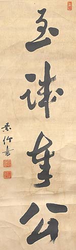 紙本肉筆・・縦89.7cm、横30.2cm 「素竹」の下に、陰刻「岩邨通世」と陽刻「素竹」の 落款が押されている。岩村素竹は東京の人で、名 は通世、号を素竹と称し、東京帝大卒業後、司法 官として名古屋地方裁判所検事正・東京検事正・ 刑事局長・検事次長・司法次官・司法大臣等を歴 任した司法官僚であるが、開戦時の司法大臣で あったために、終戦後に戦犯指名を受けて逮捕さ れるも、無罪で釈放されている。 |
