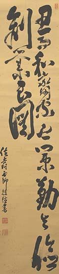 紙本肉筆・・縦129cm、横31cm 「侯爵西郷從徳書」の下に、陰刻「從徳之印」と陽刻 「西郷氏」の落款が押されている。西郷從徳は東京 の人で、名は従徳、号を南海と称し、元帥海軍大将 西郷從道の次男で、西郷隆盛の甥に当たり、陸軍 士官学校卒業後、日露戦争に従軍し、歩兵第1聯 隊大隊長・近衛第3連聯隊附・本郷聯隊区司令官 等を歴任した、陸軍大佐の軍人であるが、父の死 去に伴い西郷家の家督を継いで侯爵となり、貴族 院議員に就任し、明治天皇聖跡保存会会長や大日 本赤十字会会長等を務めている。 |