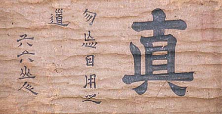 紙本肉筆・・縦19.3cm、横37.5cm 楷書の「真」の一字の後に、隷書で「勿忘日用之道」の六字が書かれ、 その後に「六六山人」の署名が有り、その下に陽刻の落款が押されて いる。石川丈山は三河の人で、名は凹、字は丈山、号を六六山人・凹 凸窩・東溪・詩仙堂などと称し、父祖以来徳川家に仕えた武士であるが 大阪夏の陣で軍令違反の罪を得、京に出て僧になるも後に藤原惺窩 の門に入って儒学を修め、惺窩門下で詩名を馳せた儒者で、江戸初期 に在って釈元政と並称される漢詩人であり、また「隷書の丈山」と称され るが如く、日本に在って最初に本格的に隷書を書いた人でもある。 |