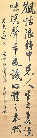 紙本肉筆・・縦141.6cm、横40.7cm 「雲濤高義質録」の下に、陰刻「高松彦太」と陽 刻「雲濤僊史」の落款が押されている。高松雲 濤は上州の人で、名は義質、通称は彦太、号 を雲濤と称し、幕末から明治にかけて高崎の寺 小屋で教え、その後県立高崎中学校で教えた 漢学者にして漢詩人で、高中の校友文芸雑誌 『群馬』(明治35年12月発刊)には、「秋日過 山村」(35年1号)・「春宵即事」(36年2号)・ 「甲辰夏日作」(37年4号)・「盛夏読書」(大正 11年34号)等々、多数の漢詩を寄稿している が、生卒等詳細は不明である。 |