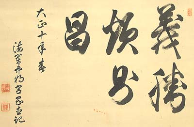 絹本肉筆・・縦42cm、横63cm 「海軍中将宮岡直記」の横に、陰刻「宮岡直記」と陽刻「海僊」の 落款が押されている。宮岡直記は加賀の人で、名は直記、号を 海僊と称し、海軍兵学校卒業後、装甲艦分隊長・水雷長・軍令 部第2局員・駐米武官・巡洋艦副艦長・砲艦艦長・海兵監事長・ 常備艦隊駆逐隊司令・鎮海防備隊司令官等を歴任した、海軍 中将の軍人である。内容は「義勝欲則昌」と書かれており、この 言葉は、中国の古典である『六韜』明伝第五に有る、周の文王 と呂尚(太公望)との問答で、太公が言った「義欲に勝れば則ち 士族将官の漢学の素養の深さには、見るべきものが有る。 |