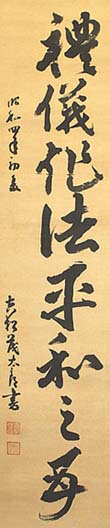 絹本肉筆・・縦143cm、横40.7cm 「吉松茂太郎書」の下に、陰刻「吉松茂太郎」と陽刻 「萬川」の落款が押されている。吉松萬川は土佐の 人で、名は茂太郎、号を万川と称し、中村藩士の子 で藩校致道館や開成学校で学んだ後、海軍兵学校 を卒業して巡洋艦分隊長として日清戦争に従軍し、 西海艦隊参謀・軍令部第1局長・常備艦隊参謀長・ 戦艦艦長を務めた後、戦艦艦長として日露戦争に 参加し、以後第1艦隊司令官・第2艦隊長官・海軍 教育本部長・連合艦隊司令長官等を歴任した、海 軍大将の軍人である。 |