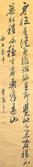紙本肉筆・・縦135.5cm、横29.5cm 「學齋主人」の下に、陽刻「昇」と陰刻「字平仲」の 落款が押されている。林學齋は江戸の人で、名は 昇、字は平仲、号を学斎と称し、林復斎の子で林 家の家学を継承して、第十二代目の大学頭となっ て寺社奉行などを務め、維新後は群馬県師範学 校教諭や日光東照宮禰宜などを歴任し、詩文を 善くした儒者である。 林家は大学頭を代々継承し、初代大学頭は羅山 ・二代鵞峰・三代鳳岡・四代榴岡・五代鳳谷・六代 代壮軒(檉宇の弟)・十一代復斎(壮軒の弟)・十 二代学斎へと、繋がって行く。 |