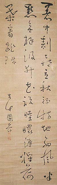 紙本肉筆・・縦125cm、横41.5cm 「古竹園五岳」の下に、陽刻の「五岳」と「古竹園章」の落 款が押されている。平野五岳は豊後の人で、名は聞慧、 号を五岳・潜龍・古竹園などと称した僧で、詩を広瀬淡窓 に学び、画を田能村竹田に学び、釈門に於けるその詩 名は「東の六如、西の五岳」と言われているが、同時に 書・画にも長じており、詩・書・画を同時に善くしたため、 「鎮西の三絶僧」とも称されている。 |