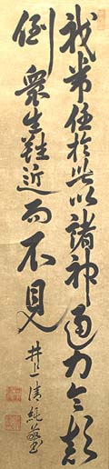 紙本肉筆・・縦140cm、横34cm 「井上清純敬書」の下に、陰刻「井上清純」と陽刻「 蘭堂」の落款が押されている。井上蘭堂は鹿児島の 人で、名は清純、号を蘭堂・聴雪などと称し、外交官 吉田清成の二男であるが海軍中将井上良智の養 子となり、海軍兵学校卒業後、巡洋艦の分隊長や 砲術長・工作艦航海長・海防艦副長・砲艦艦長等を 歴任した海軍大佐の軍人であるが、聖応院本多日 生上人に師事して法華経の遊説を行い、退役後は 貴族院議員を務めながら、講妙会を主宰して青年 の教育に尽力している。 |