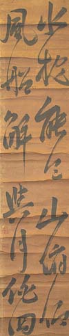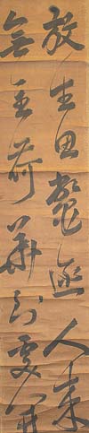 紙本肉筆・・縦125cm、横26cm 陰刻「ハン(馬+風)足萬里」と陽刻「鳳卿氏」の落款が押されて いる。帆足愚亭は豊後の人で、名は万里、字は鵬卿、号を愚 亭・西エン(山+奄)などと称し、初め業を脇蘭室に学び、次い らにも学び、その学は和漢古今を究めて天文・経済から医学 ・蘭学にまで精通し、特に経世の術に関しては卓然自得した ものが有り、日出藩に仕えて家老職を務めた儒者で、その学 称を得ている。尚、本品は本来一枚の七絶であるが、それを 半分にして対聯に仕立てたものである。 |